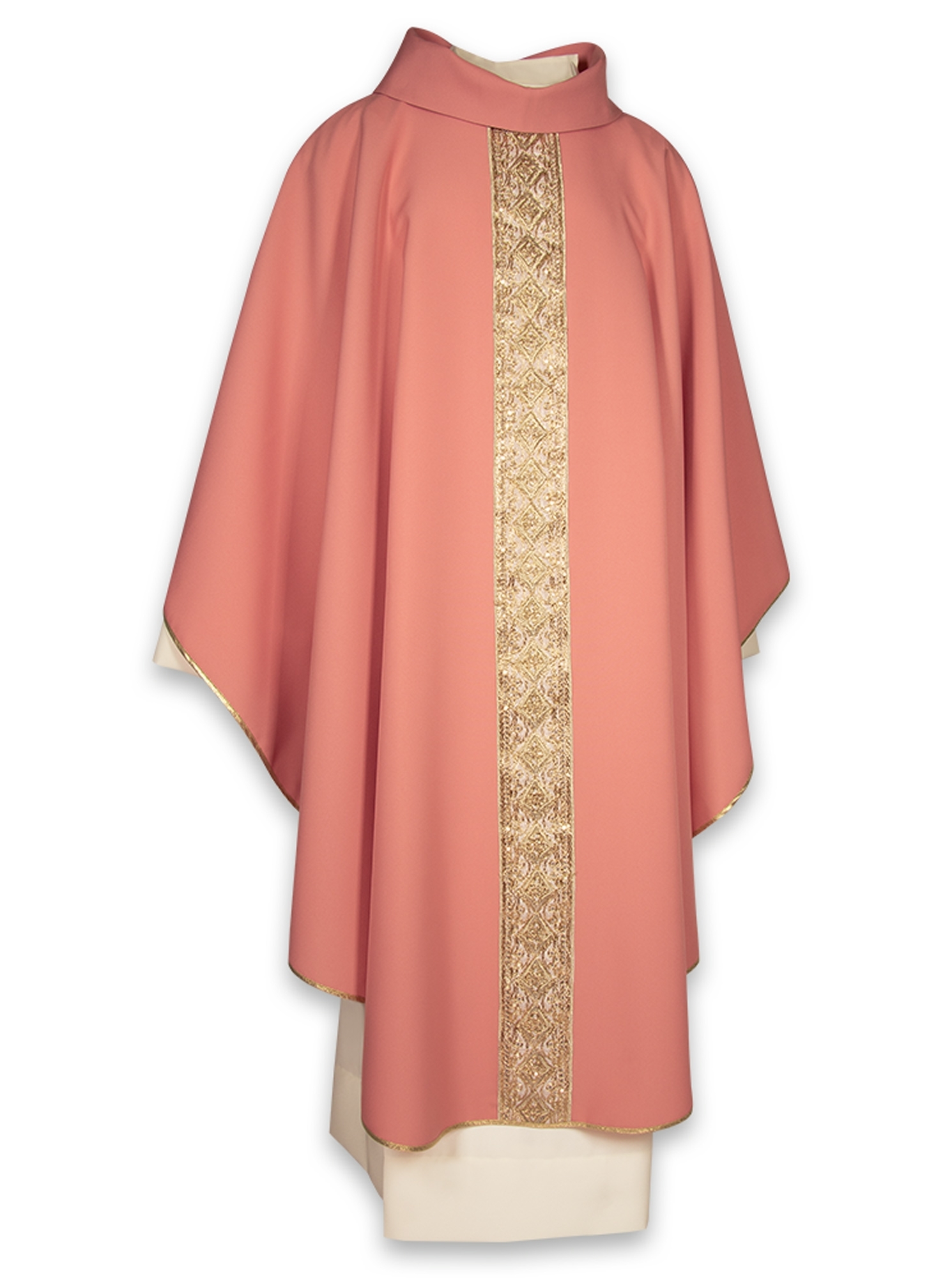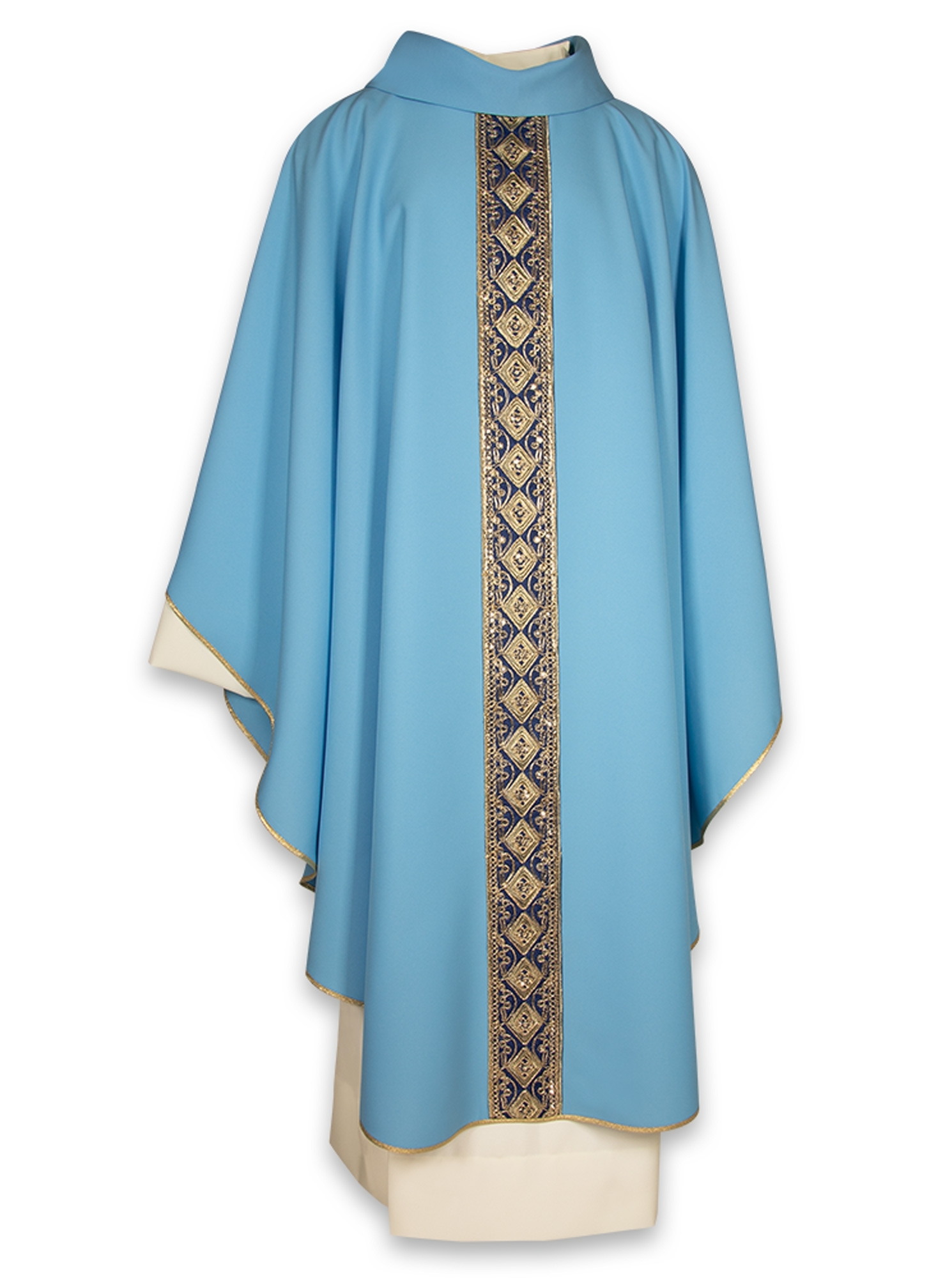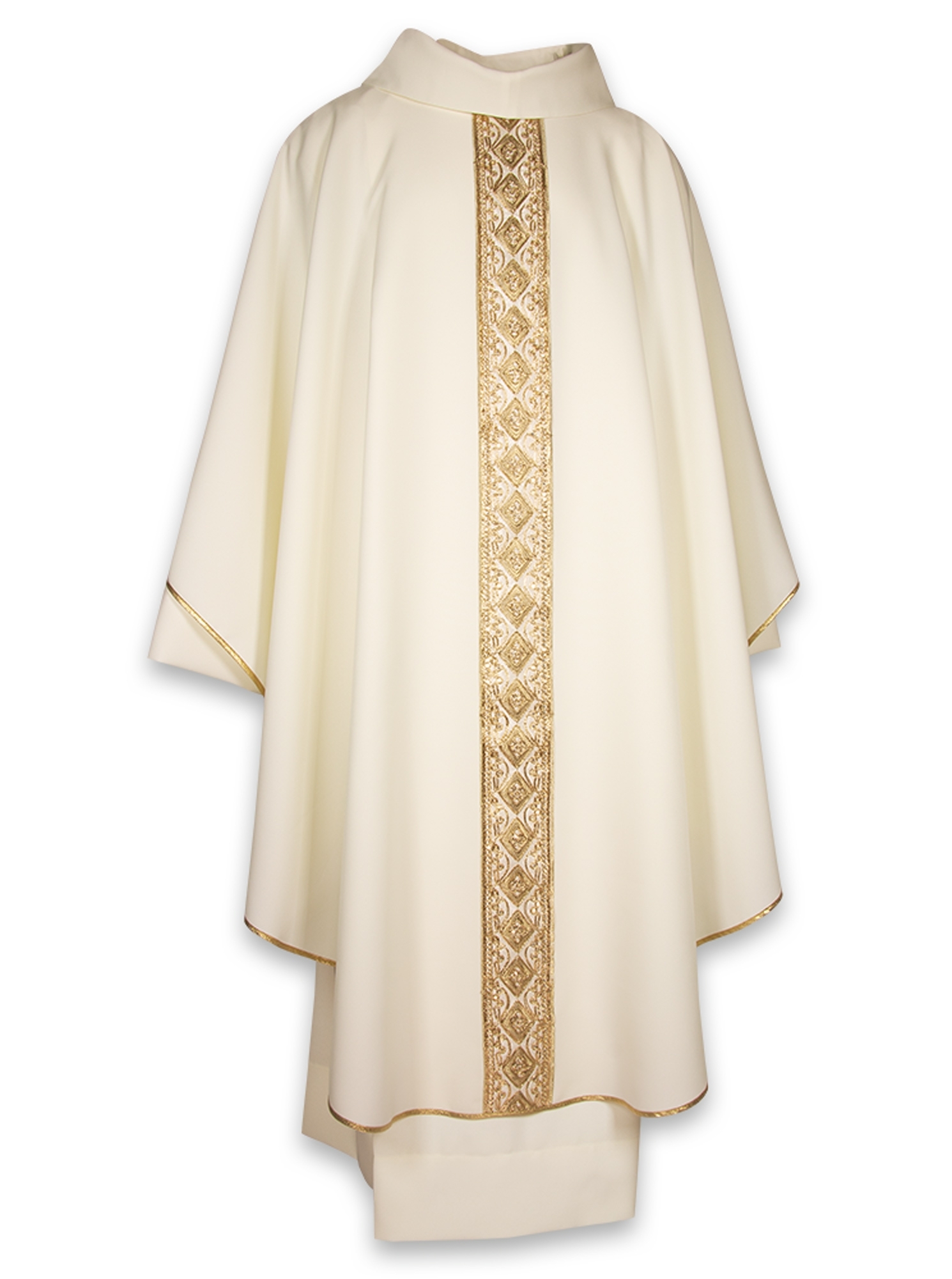 Collo tondo con finto cappuccio, rifinita interamente con sbieco dorato, viene fornita con relativa stola ed è disponibile in 8 colori liturgici.