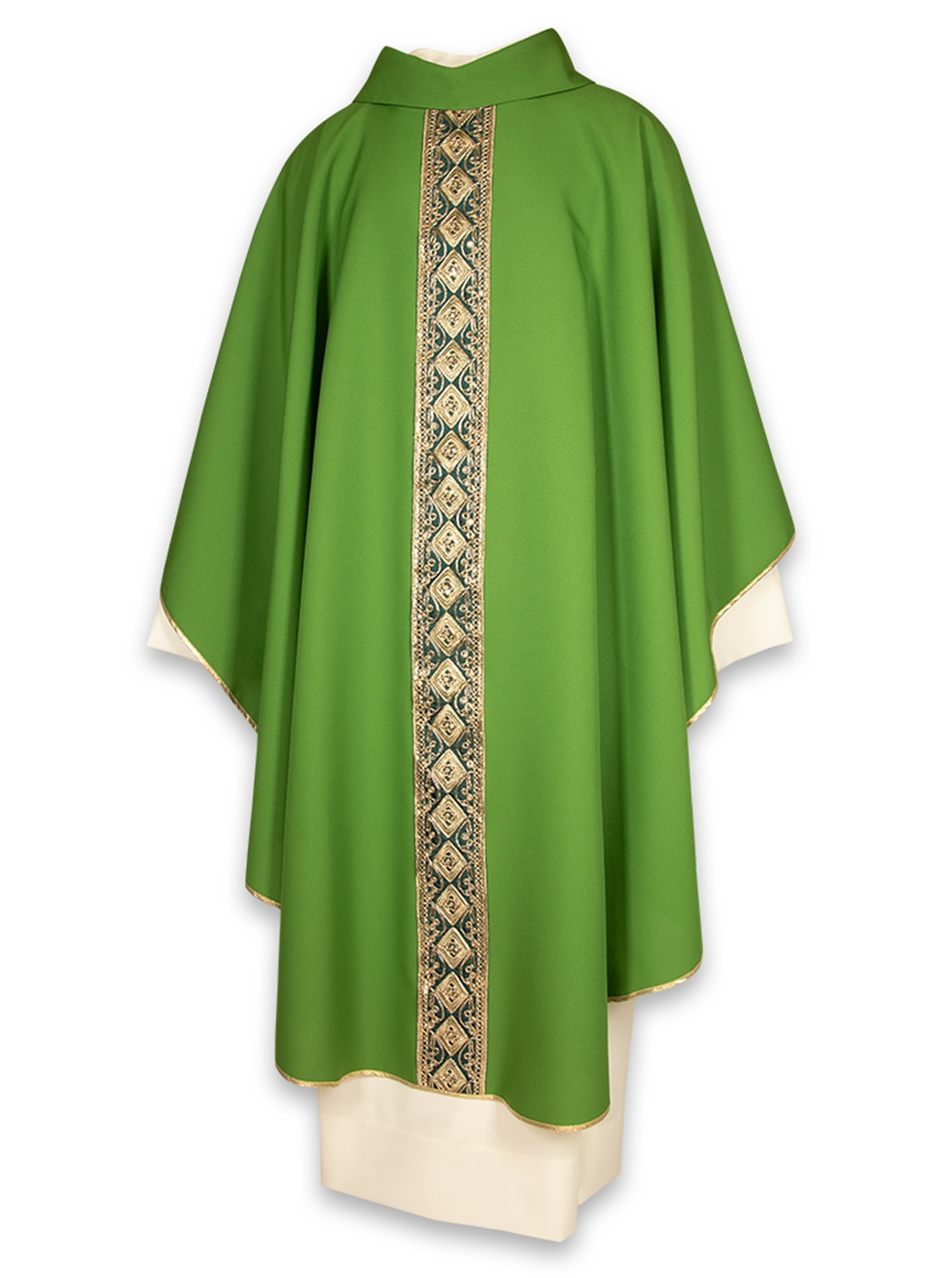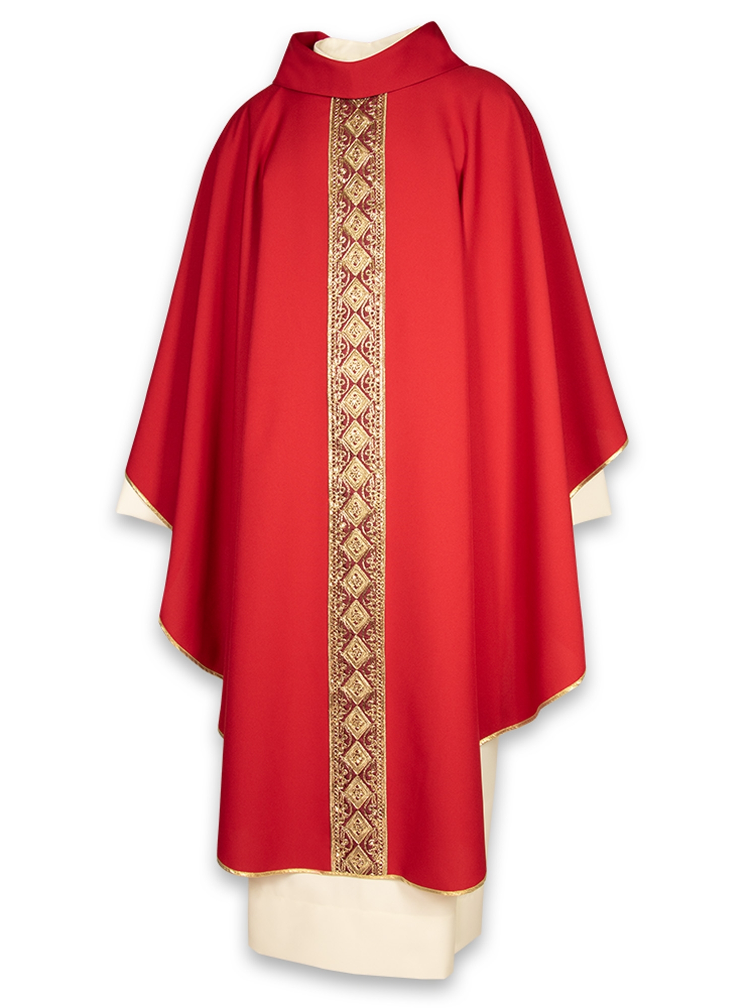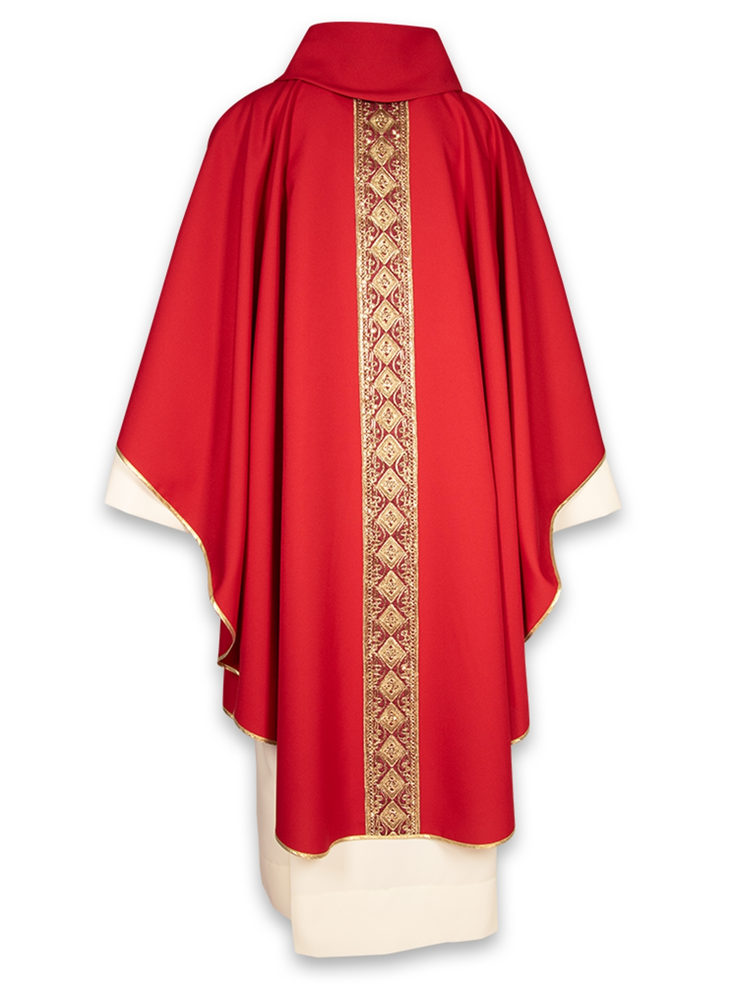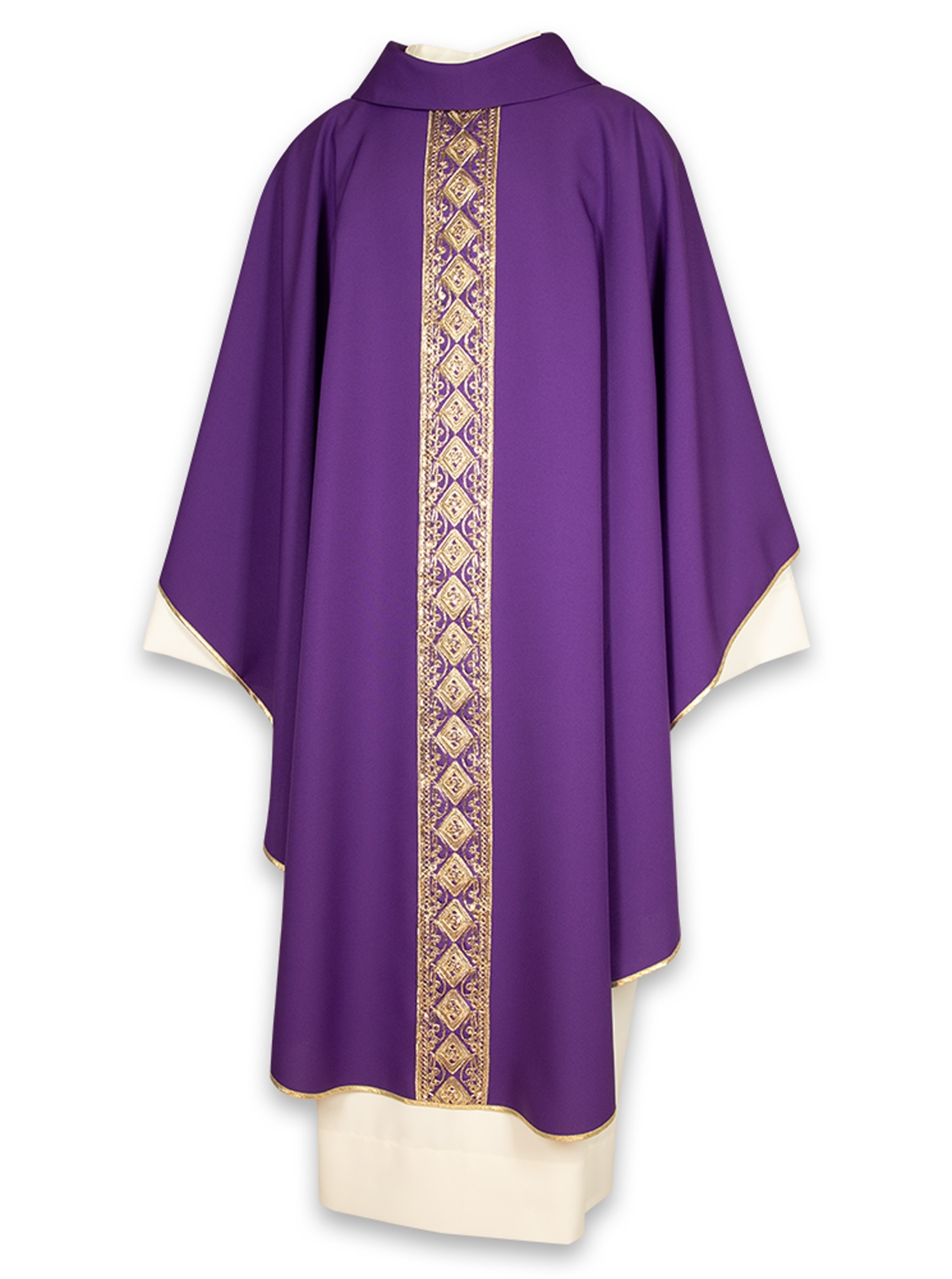 Collo tondo con finto cappuccio, rifinita interamente con sbieco dorato, viene fornita con relativa stola ed è disponibile in 8 colori liturgici.