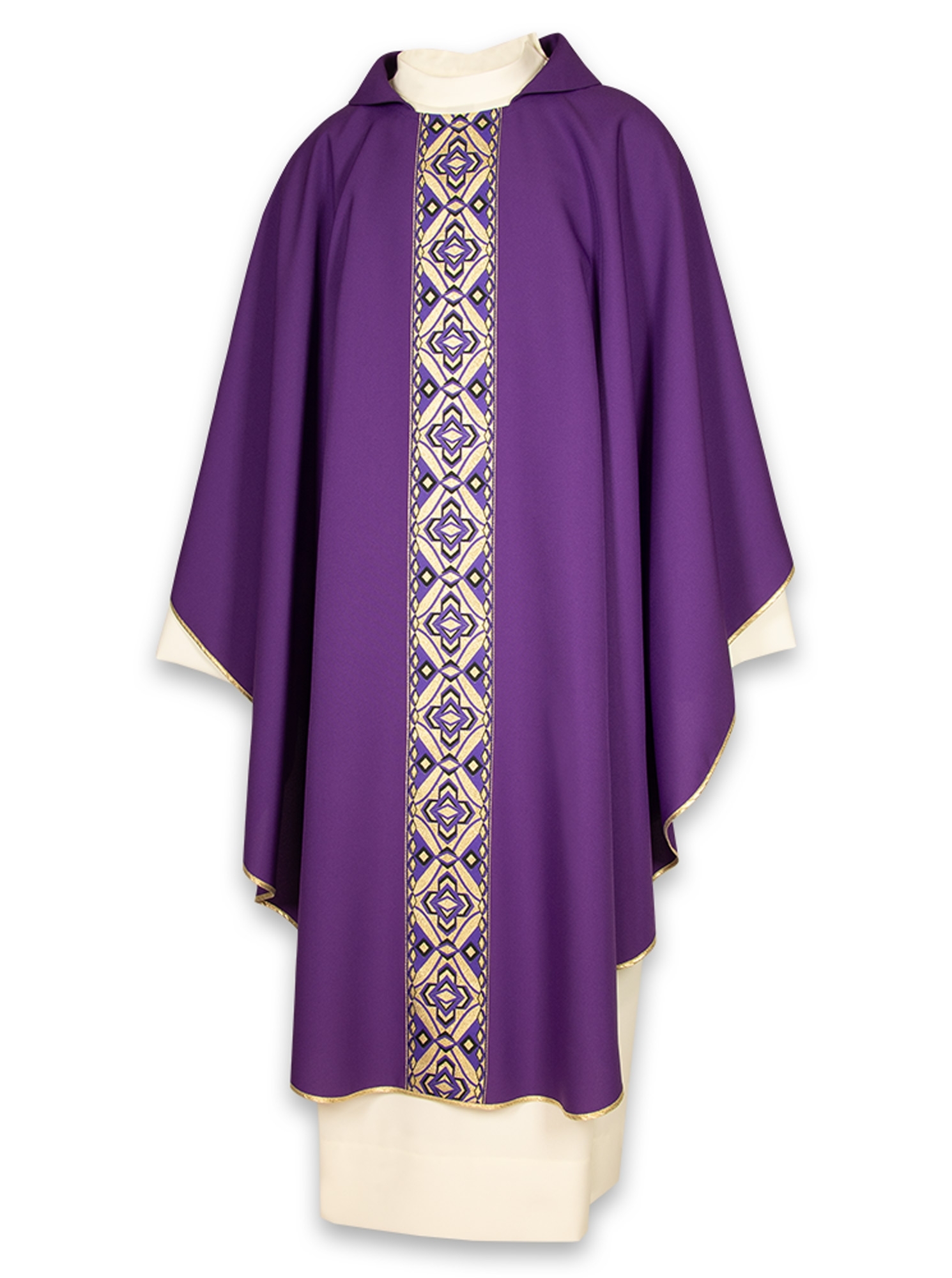 Collo quadro con finto cappuccio, rifinita con sbieco e bordura dorata, fornita con relativa stola, disponibile in 8 colori liturgici.