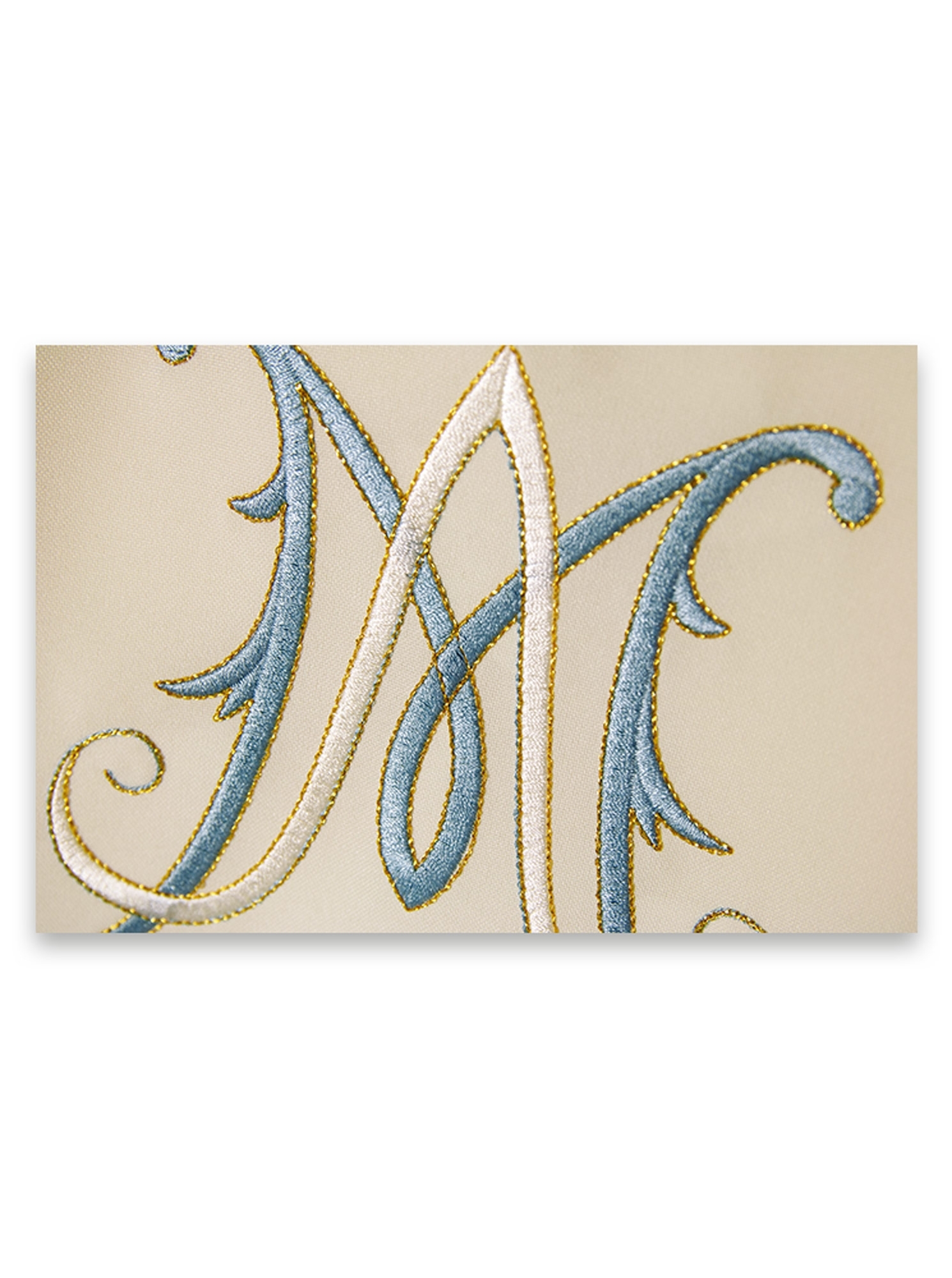 Casula con ricamo diretto a filo oro e sfumature, il disegno mariano ricco di particolari conferisce unicità al paramento.