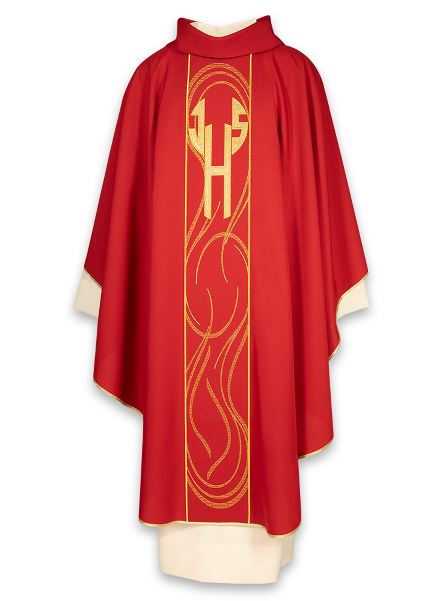 Casula con applicazione in raso oro cucita tramite ricamo a filo metallico, la simbologia viene ricavata in negativo tramite uno speciale processo produttivo che dona unicità al capo.
