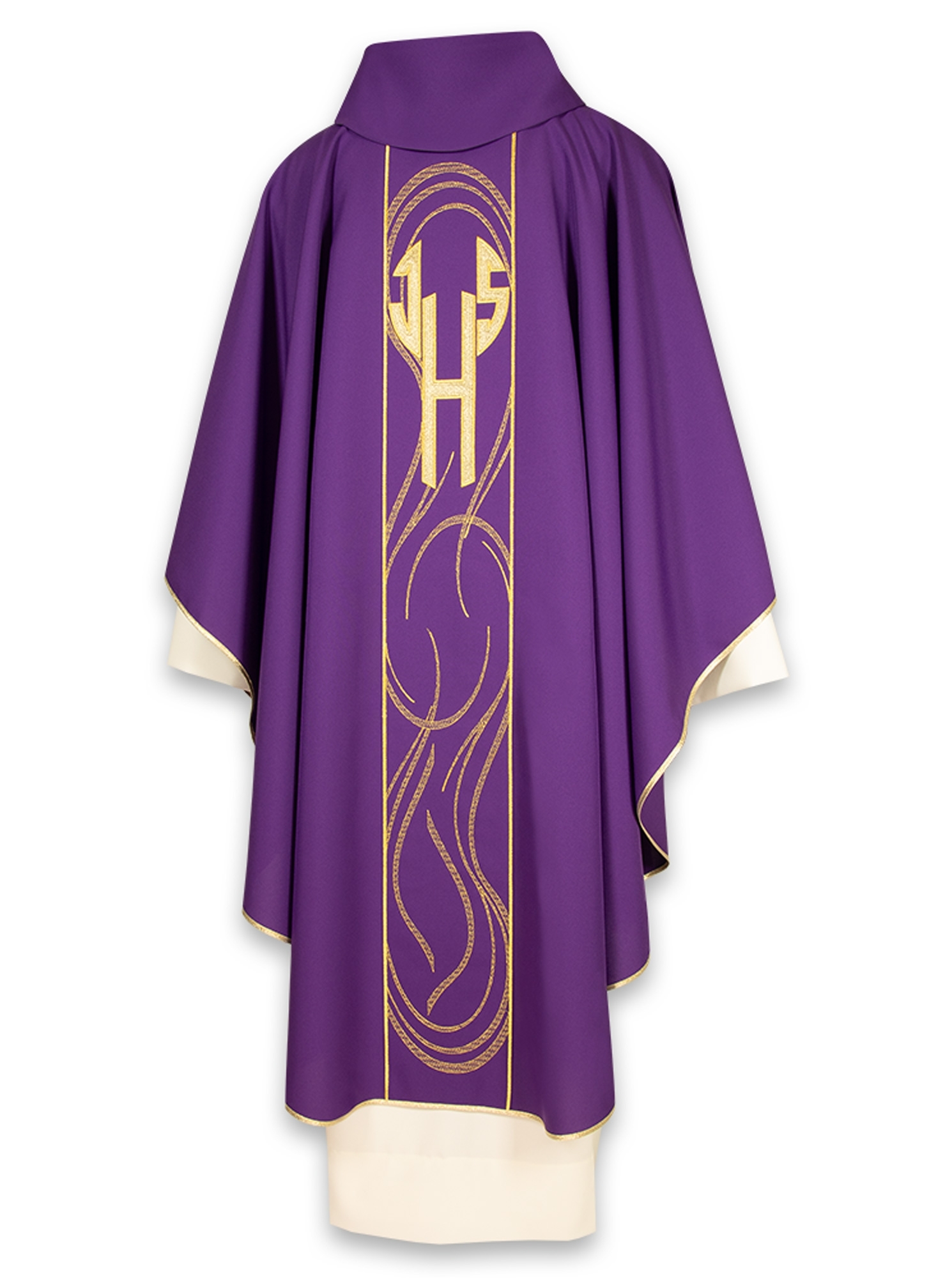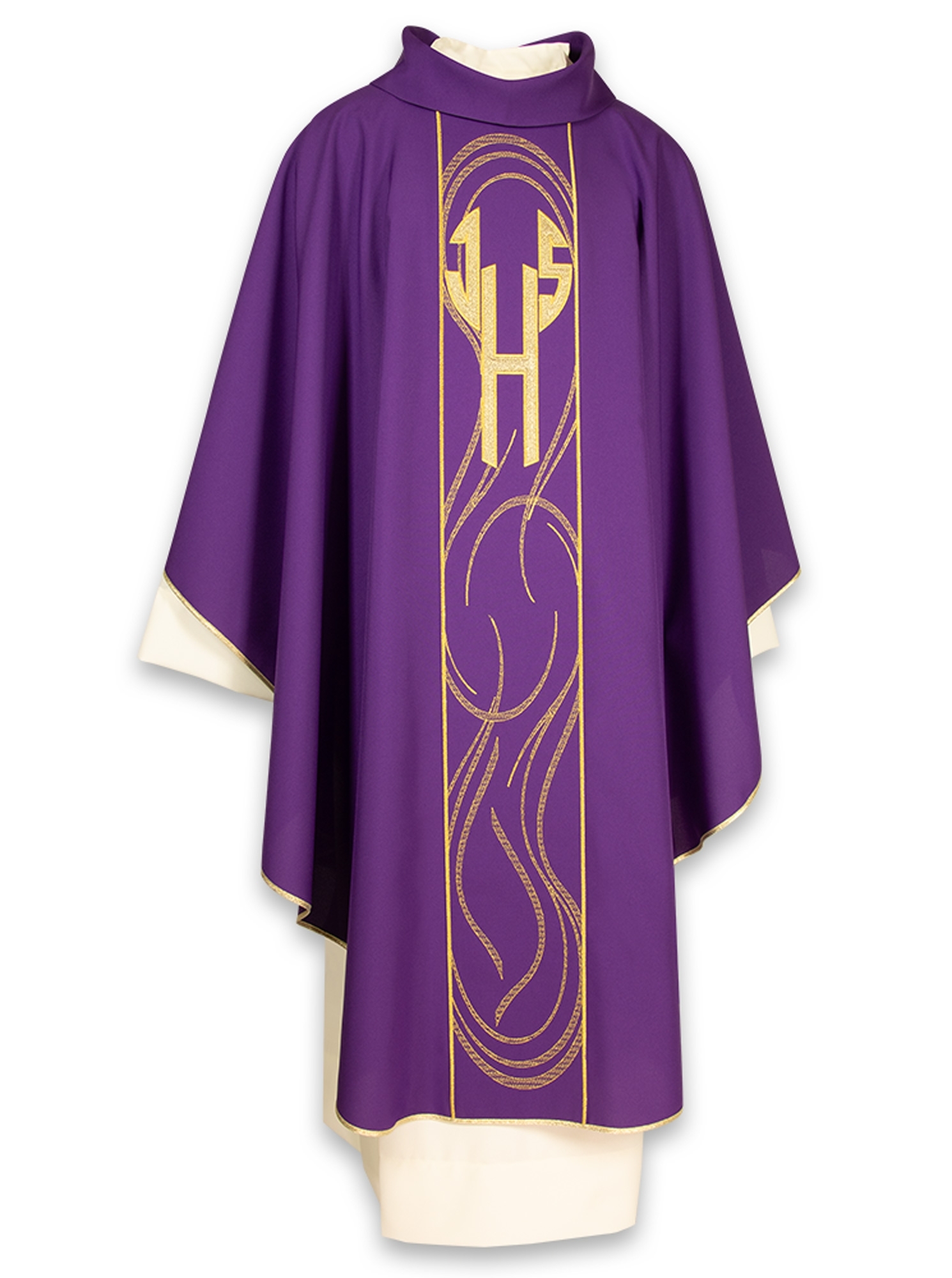 Collo tondo con finto cappuccio, rifinita interamente con sbieco dorato, disponibile in 5 colori liturgici, viene fornita con relativa stola.