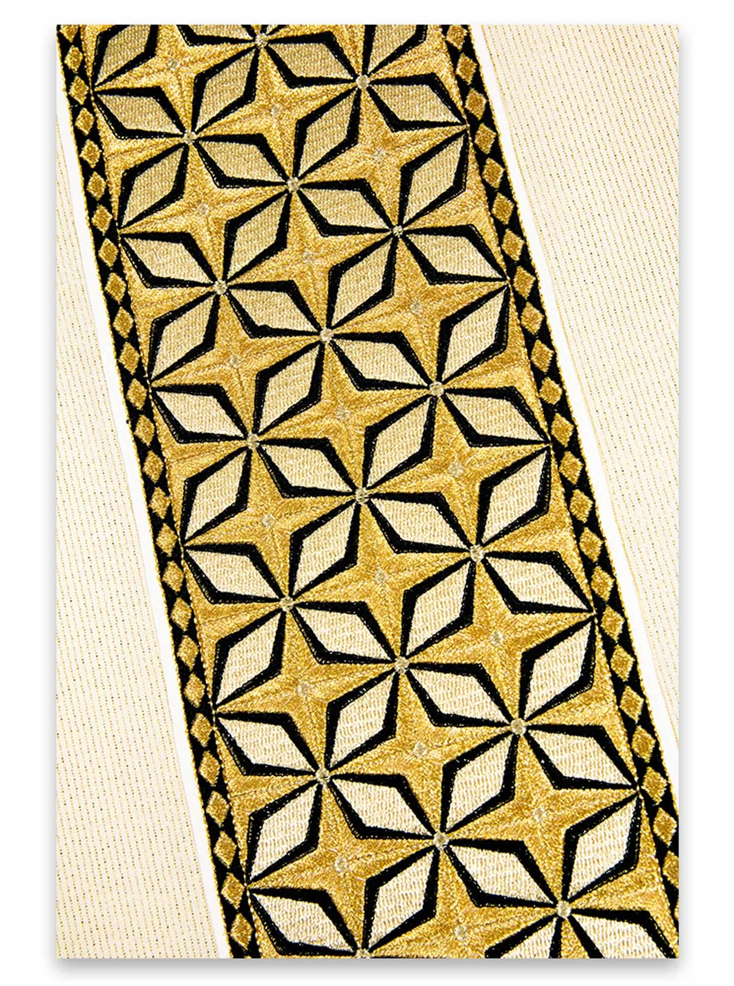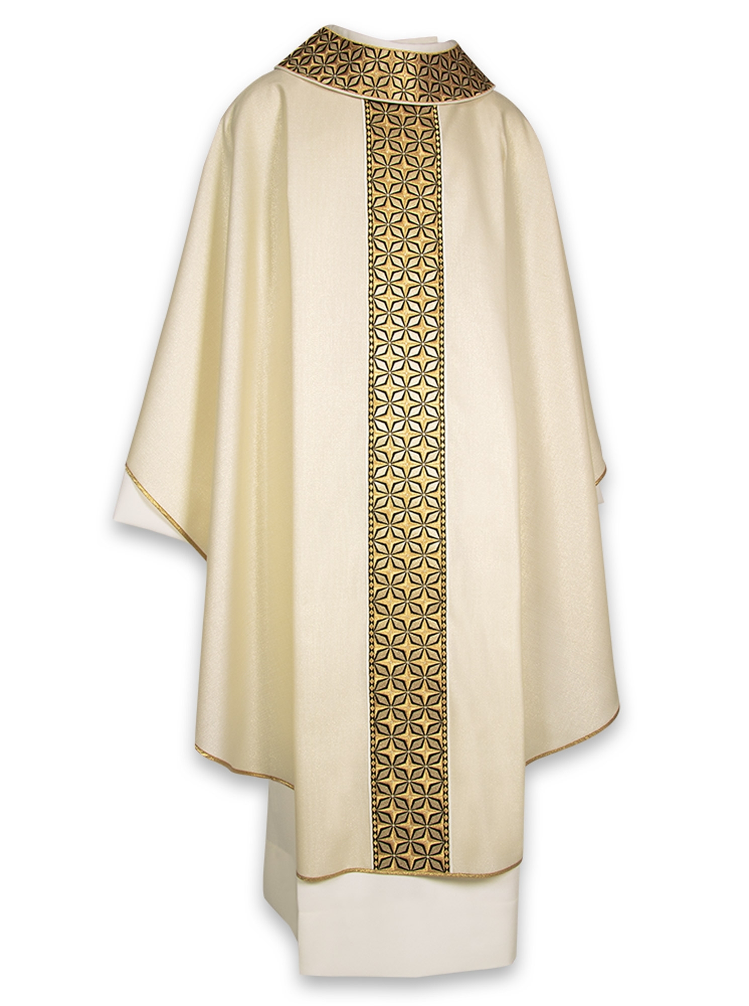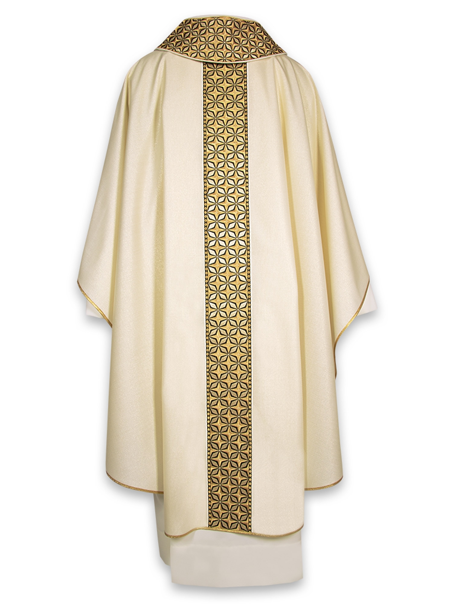 Casula a filo oro con degradazioni beige che attenuano e particolari neri che danno contrasto al prezioso ricamo.