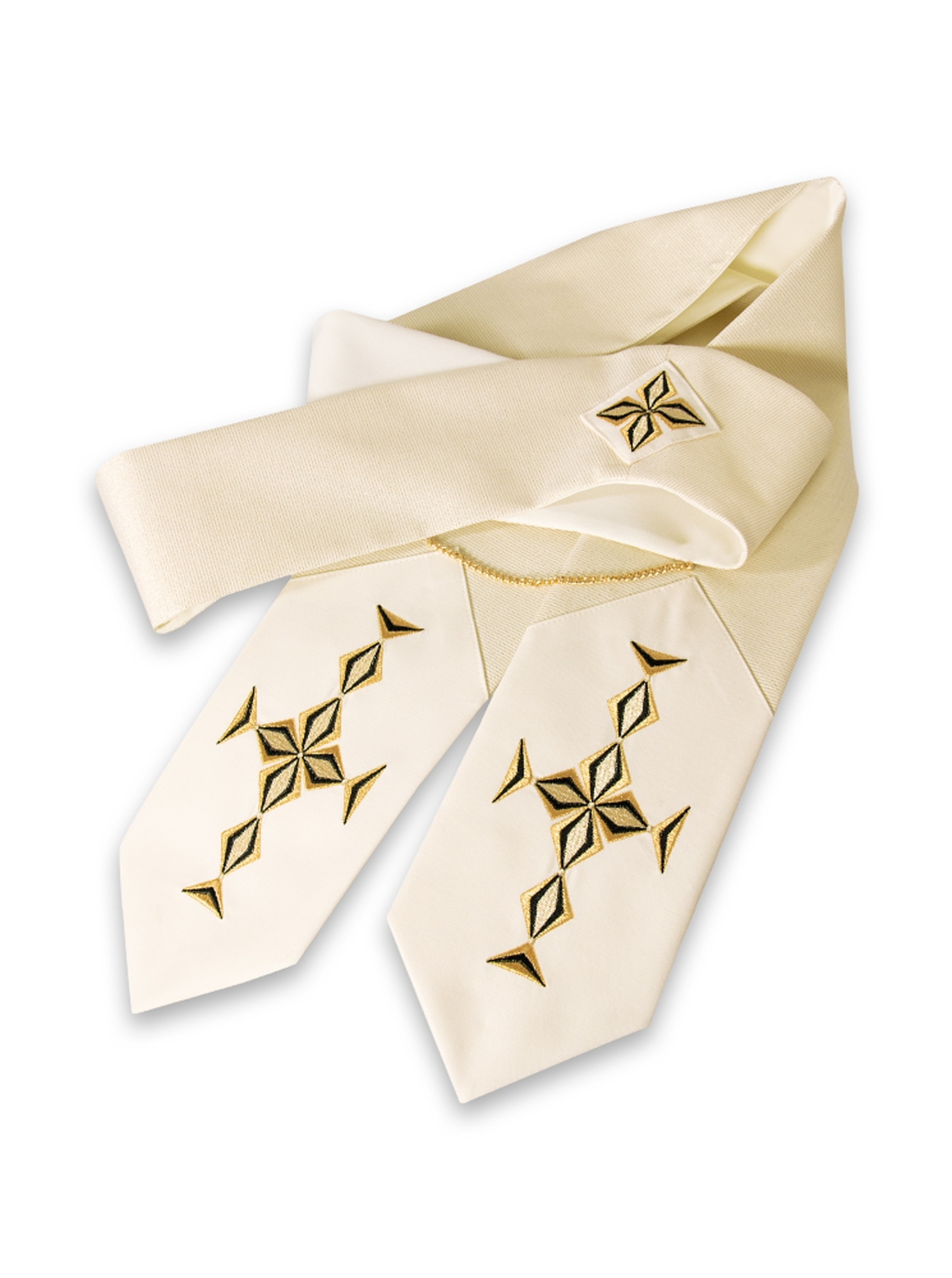 Collo tondo e stola anch'essi interamente ricamati, rifinita con bordura dorata, realizzata in 4 colori liturgici.