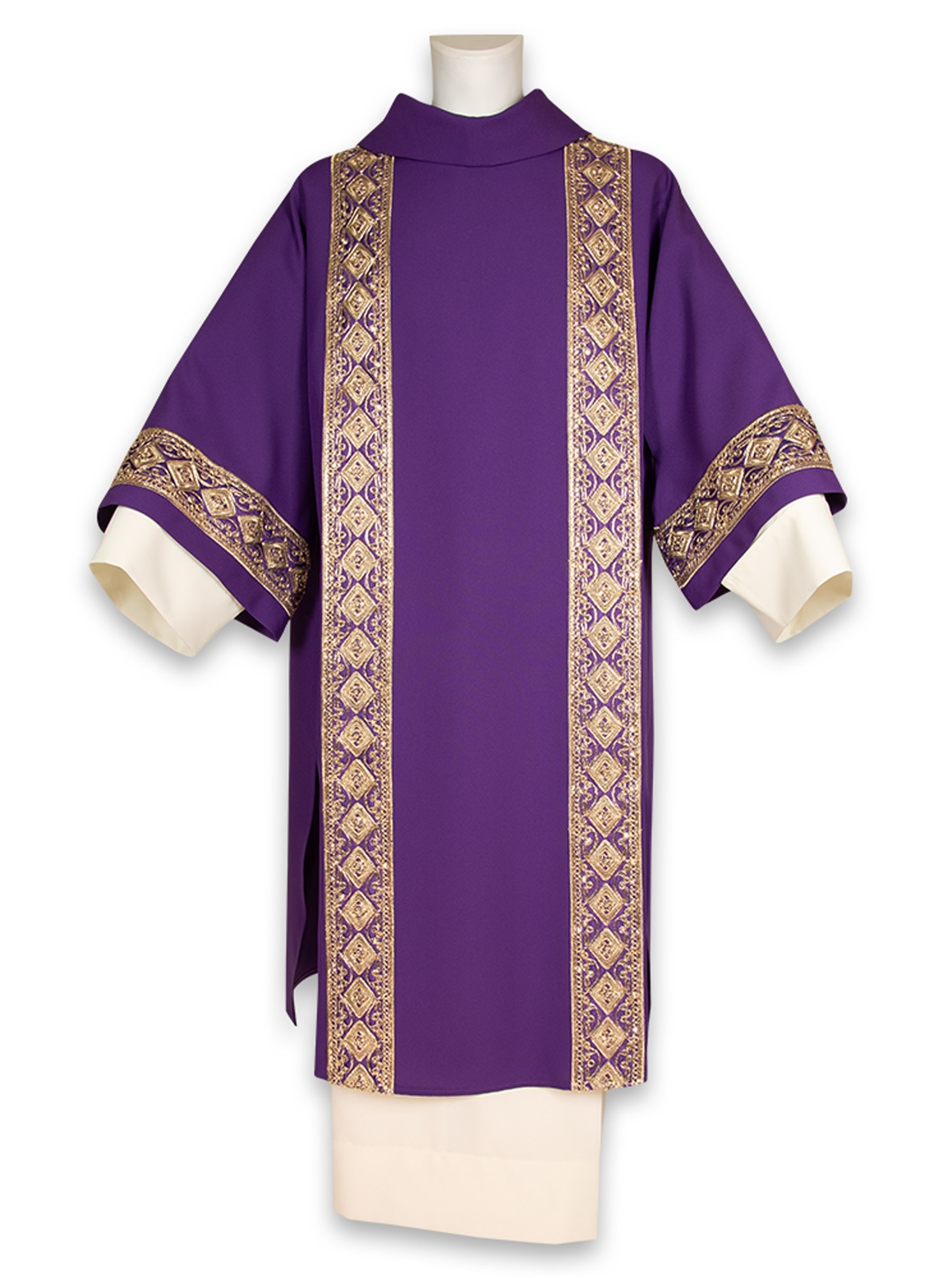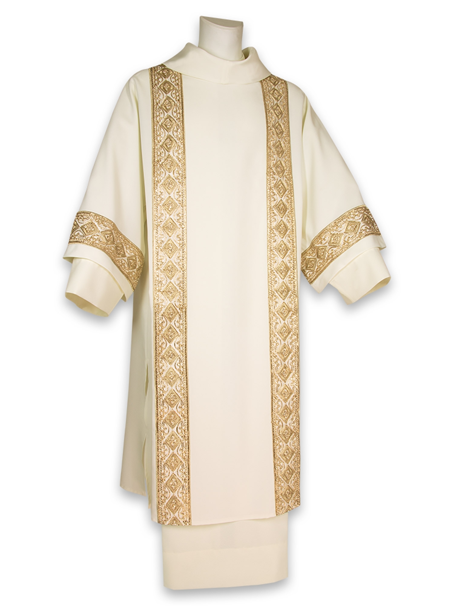 Dalmatica ornata nei bandoni laterali e sulle maniche con un prezioso bordo dorato lavorato a filo/spessore che dona lucentezza e pregio al paramento.