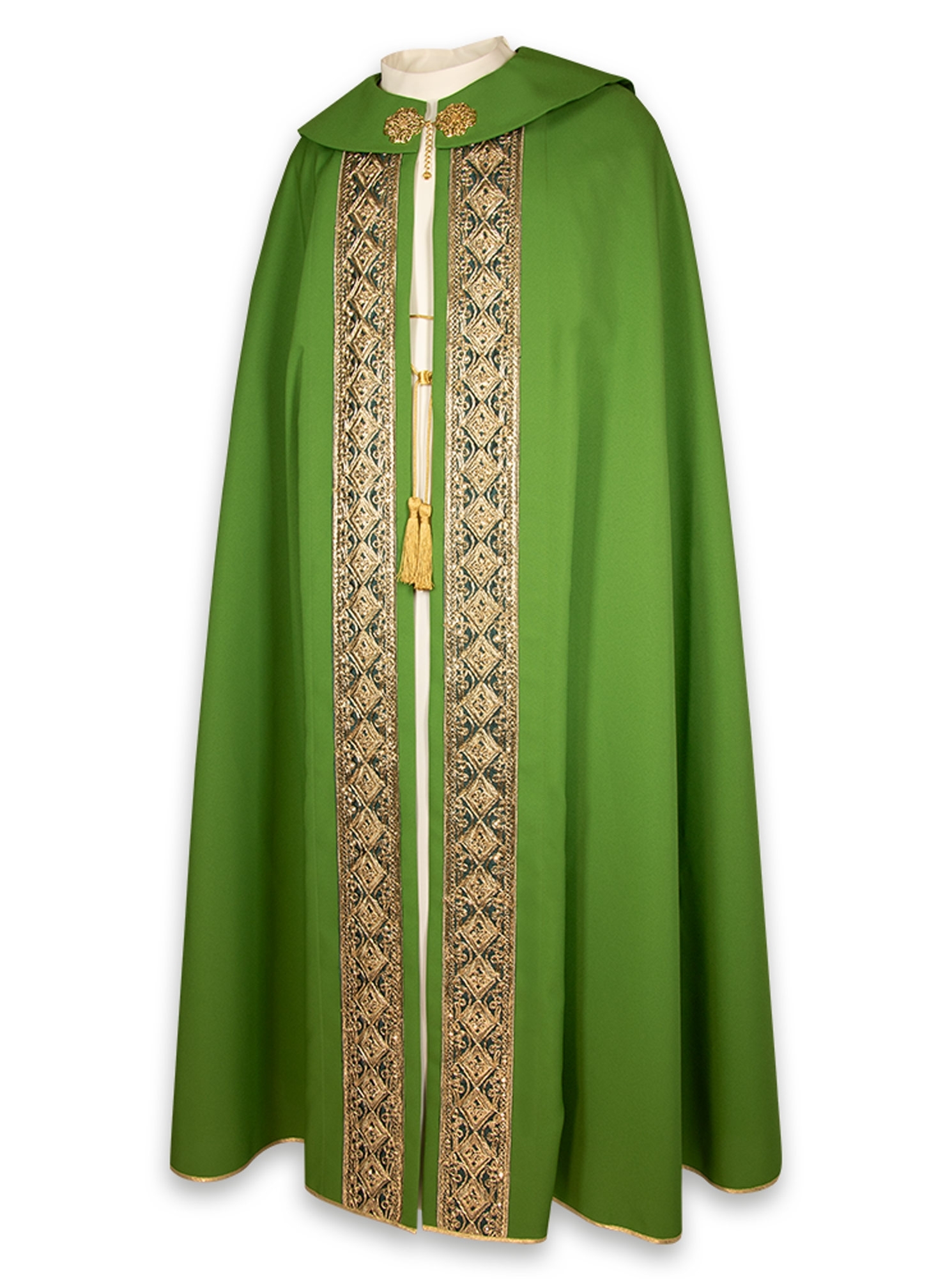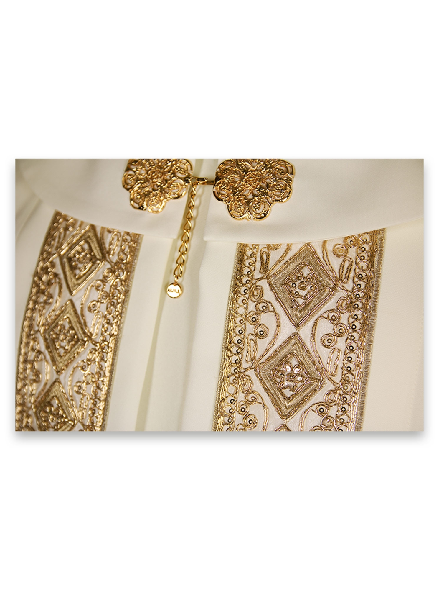 Piviale ornato con un prezioso bordo dorato lavorato a filo/spessore cucito sul davanti e nello scudo posteriore, particolari come il gancio/fermaglio e la cordoniera contribuiscono a dare unicità al paramento.